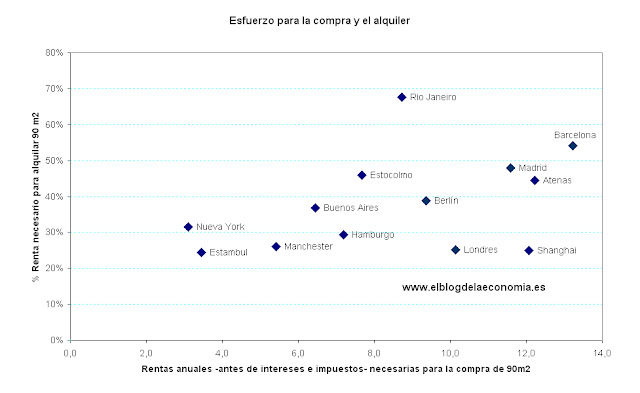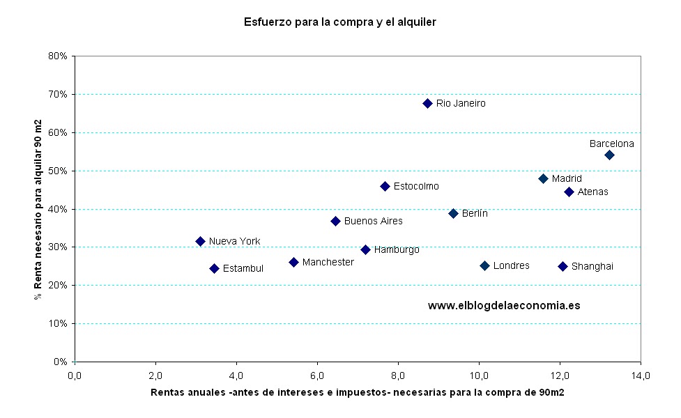 Si el esfuerzo para acceder a una vivienda en Madrid y Barcelona converge con el de otras ciudades occidentales, de tal manera que para adquirirla fueran necesarias 7 rentas brutas anuales, el precio medio €/m² debería ser de unos 2.300 €/m² en el caso de Madrid y de en torno a 2.000 €/ m² en Barcelona. Esto supone un sobreprecio del 25% para Madrid y del 43% para Barcelona sobre los precios del 8 de Diciembre de 2010.